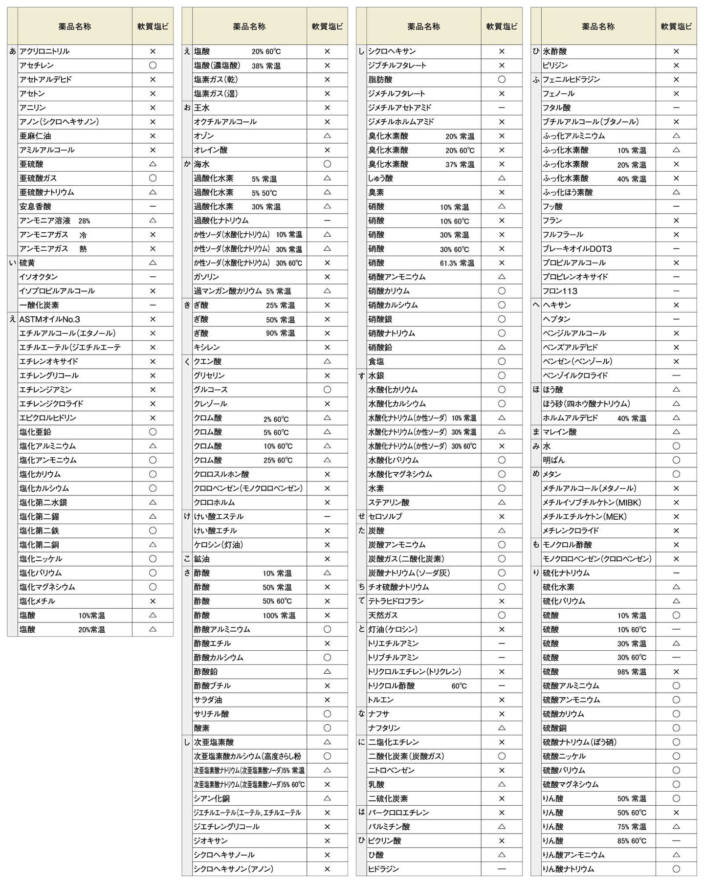 - この一覧表は耐薬品性表であり、薬品が気体である場合の透過率を表すものではありません。